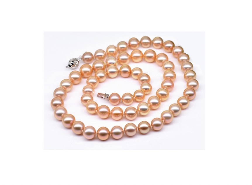 This pink/peach pearl necklace is composed of 9-10 mm freshwater pearls. The shape is very near perfect round and the pearls exhibit a sharp luster and clean surfaces. Each piece comes with an elegant gift box and certified jewelry appraisal.
